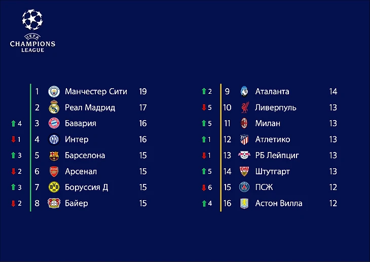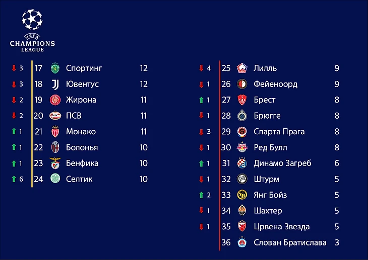 Максимум в группе можно будет набрать 24 очка, если победить во всех 8 матчах. Но команд-то больше. Их 36, а это значит, что многие обязательно наберут по итогу одинаковое количество очков. Уровень плотности в таблице увеличит и более равномерное распределение силы соперников. Если раньше для команды из первой корзины самым сильным соперником на бумаге был кто-то из второй корзины, то теперь появились матчи уровня «Манчестер Сити» - «Интер» (кстати, уже в первом туре!), «Реал Мадрид» - «Ливерпуль». Но аналогичные рассуждения можно провести и для участников четвертой корзины. Как вам, например, вывеска «Штурм» - «Брест»? Терять и набирать очки будут все.