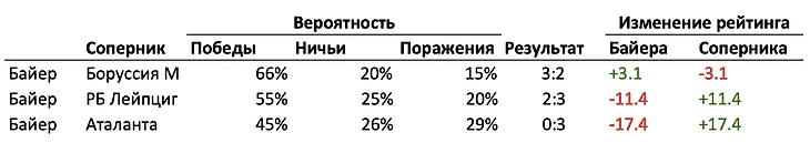 И с этим нам помогает рейтинг Эло (clubelo.com). Это показатель силы команды, который меняется по результатам каждой игры. Среди участников Лиги Чемпионов по состоянию на 13 сентября максимальный рейтинг у «Манчестер Сити» - 2060 баллов, а минимальный у «Слована» из Братиславы - 1446 баллов. Если команда достигает положительного для себя результата относительно изначальных раскладов, рейтинг растет, и наоборот. Чем ниже была вероятность победы и чем больше разница голов, тем больше рост рейтинга за матч. Рассмотрим на примере «Байера». Победа над «Боруссией М» в первом туре Бундеслиги 3:2 была ожидаема (66% вероятности перед матчем) и принесла команде +3.1 балла к рейтингу Эло. «Боруссия М» потеряла те же 3.1 балла в рейтинге. Во втором туре леверкузенцы проиграли первый с мая 2023 года матч в чемпионате: «РБ Лейпцигу» со счетом 2:3. Вероятность поражения до матча оценивалась всего в 20% и поэтому рейтинг «Байера» упал на 11.4 балла. Рейтинг же «РБ Лейпцига» вырос на те же 11.4 балла. Прошлый финал Лиги Европы леверкузенцы проиграли «Аталанте» и вовсе 0:3. Неожиданно разгромный счет отобрал еще больше - 17.4 балла.