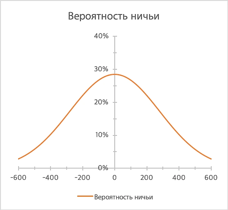 Вот таким получается график функции вероятности ничьи в зависимости от разницы в рейтинге между двумя командами. Это нормальное распределение в виде «колокола». Когда разница между командами в районе нуля, вероятность ничьи порядка 28%. С увеличением разницы падает шанс на ничью. И, например, для матча «Слован Братислава» - «Манчестер Сити» (самый неравный матч турнира - 614 баллов разницы) ничья ожидается с вероятностью всего 3%.