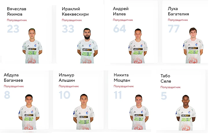Полузащитники: Табо Селе, Абдула Багамаев, Ильнур Альшин, Никита Моцпан, Вячеслав Якимов, Ираклий Квеквескири, Андрей Ивлев, Лука Багателия.