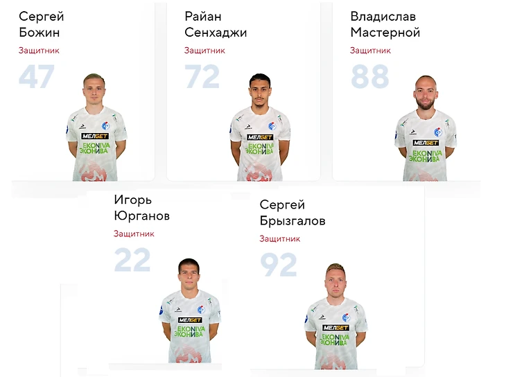 Защитники: Игорь Юрганов, Сергей Божин, Райан Сенхаджи, Владислав Мастерной, Василий Черов, Сергей Брызгалов.