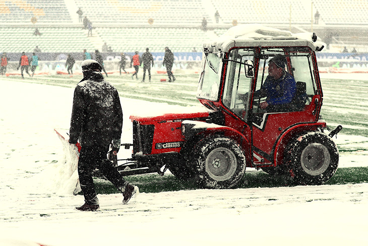 Снег активно убирали еще до игры, но сильно падать продолжало и во время матча.