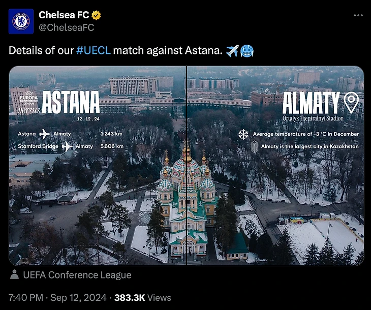 «Челси» в соцсетях отметил, что «Стэмфорд Бридж» и Алматы разделяет 5 606 км. А рекорд Лиги конференций установили «Кайрат» и «Базель» в 2021-м – 5 263 км.