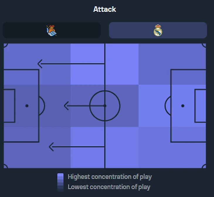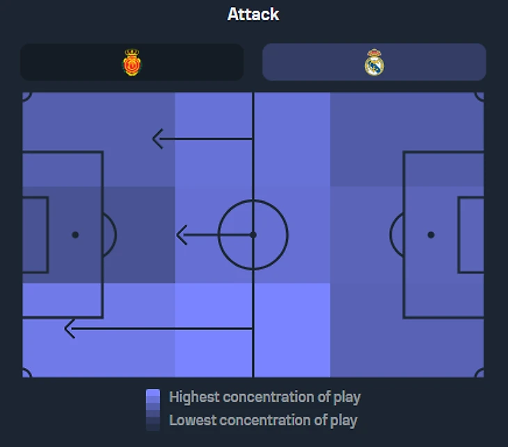 И потом, это был отнюдь не полноценный топовый матч, несмотря даже на градус борьбы и накал. А вот что будет происходить в условном Эль-Классико, где игроки в априори больше опираются на инстинкты и рефлексы, нежели на установку тренера (собственно, «Реал» так и выиграл 15 ЛЧ) - большой вопрос, и пока мы не получим ответ на него, заявлять о полной ликвидации этой проблемы будет рано. Ну и ловите на последок небольшое сравнение загруженности зон, через которых шли атаки «Мадрида» сегодня и против «Мальорки», что бы мои высказывания не выглядели голословными: