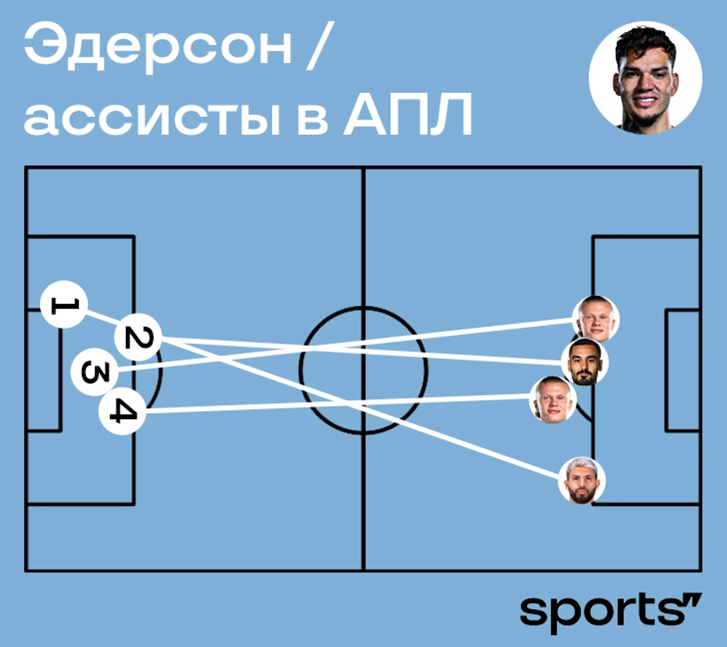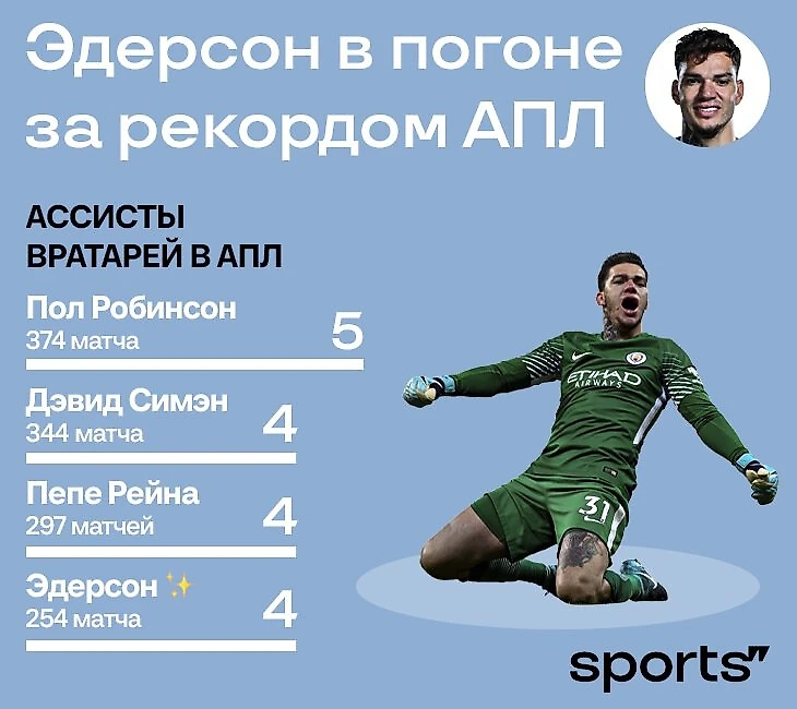 Эдерсон – первый вратарь с ассистом в АПЛ-2024/25. И второй в общем зачете за всю историю лиги. Бразилец справляется заметно быстрее коллег.