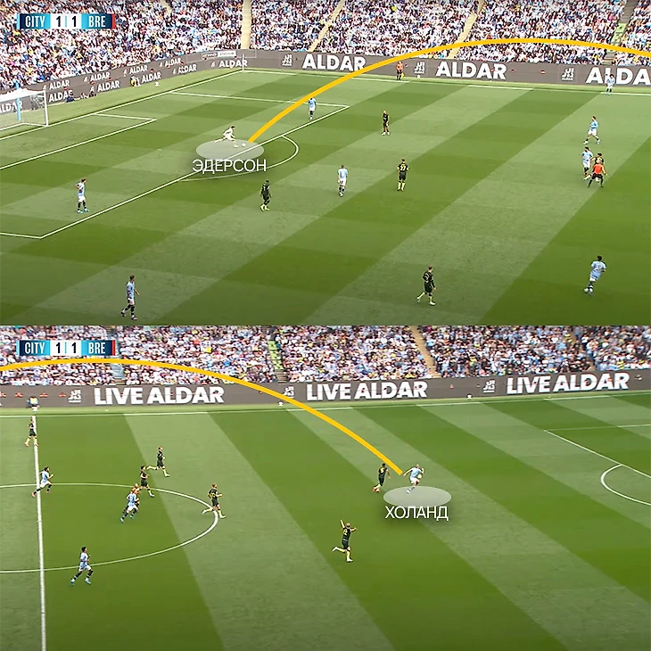 Механизм всегда один: за счет качества паса Эдерсон находит одного из партнеров в высокой позиции и наказывает зазевавшихся соперников. Атакующие игроки «Сити» стартуют из глубины, исключая риск офсайда. Меняются лишь мелкие настройки: Агуэро и Гюндоган технично обыгрывали оппонентов, Холанд раскидывал корпусом. Кстати, после сезона с ассистом у Эдерсона неминуемо идет сезон без голевой передачи. Правило работает с 2018-го!