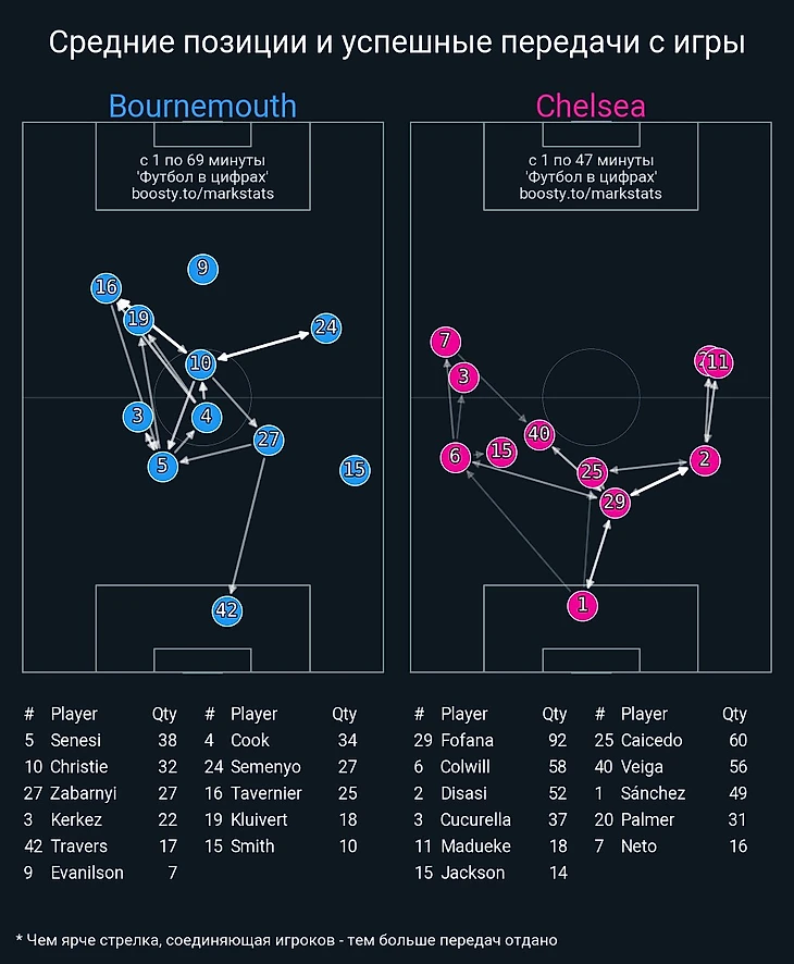 Активный прессинг «вишен» вынуждал «Челси» уводить игру с центра поля во фланги. Средние позиции, приведенные ниже, только подтверждают этот факт. В игре на фланге многое зависело от индивидуального мастерства футболистов, и «Челси» за первый тайм проведет 8 попыток дриблинга, из которых успешными окажутся лишь 4 (два на счету Нони Мадуэке).