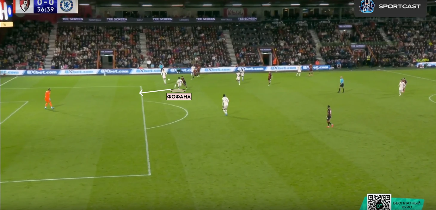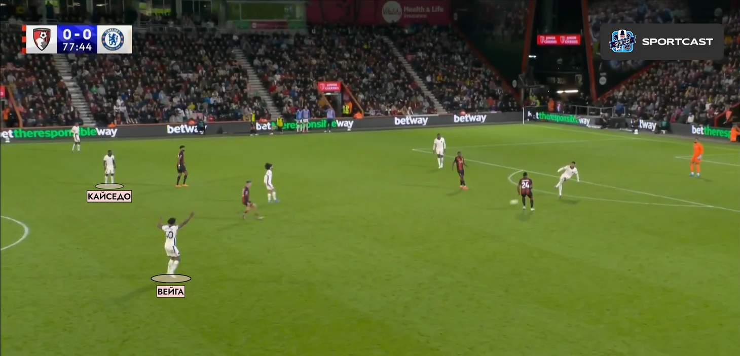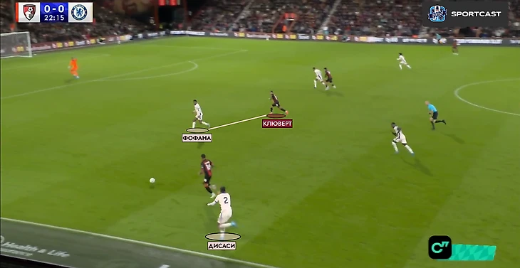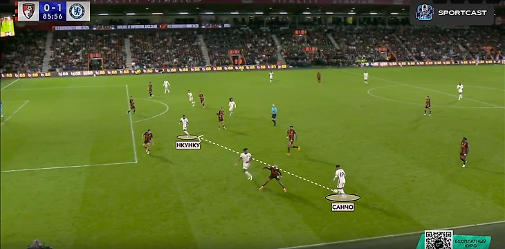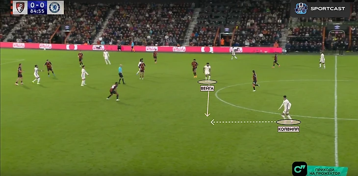Борьба. В завершающей стадии атаки, Кристофер Нкунку выиграл в борьбе за мяч у троих футболистов «Борнмута». И вне контекста, отметим отличное забегание все того же Вейги, который отвлек на себя внимание сразу двух игроков «Борнмута» – Забарного и Араухо.