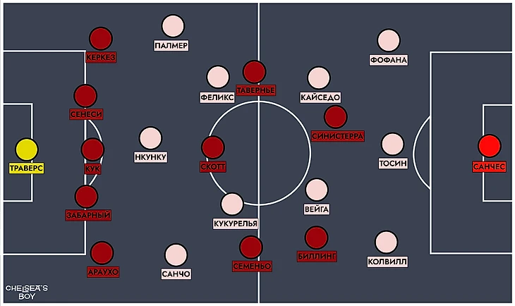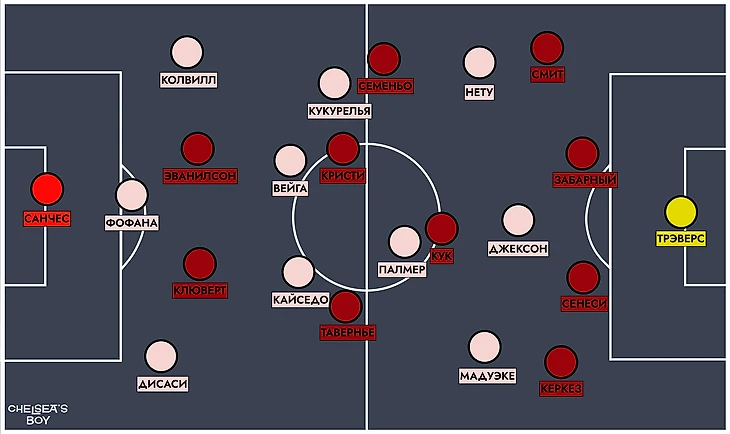 Спустя некоторое время вместо Кука в пару к Кристи встал Тавернье, а сам Льюис ушел ниже к опорной зоне, действуя по Коулу Палмеру. А по Марку Кукурелье работал Семеньо.