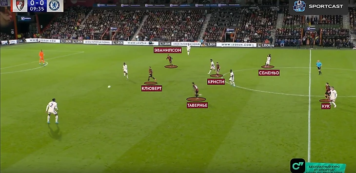 Первое что бросается в глаза – это насколько узко играл «Борнмут» в обороне. Особенно, в центре поля. Пара «Клюверт – Эванилсон» оказывали давление на тройку защитников гостей, когда как Кристи и Кук акцентировали свое внимание на Вейге и Кайседо, перекрывая передачи на опорников «Челси». Защитникам «синих» оставалось только доводить мяч до группы атаки длинными передачами. За первый тайм «синие» выполнят 26 длинных передач – до адресата дойдут лишь 9.