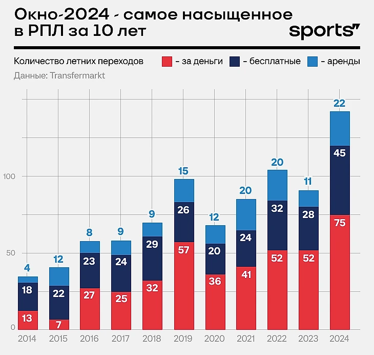 Летнее трансферное окно РПЛ запомнилось большой активностью не только топов, а вообще всех. Клубы оформили почти полторы сотни переходов – наивысший результат минимум за 10 лет. Для сравнения: летом 2014-го зафиксировано только 35 трансферов.