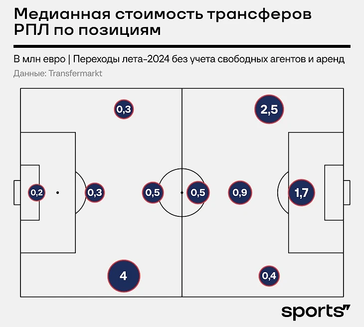 При этом стоимость не коррелирует с количеством трансферов игроков определенной роли. Например, этим летом самой дорогой оказалась позиция правого защитника, но учитывайте, что трансферов за деньги было лишь три (Сергей Волков в «Зенит», Джованни Гонсалес в «Краснодар», 19-летний Арсений Агеев в «Локомотив»). Так что на картину влияет малая выборка.