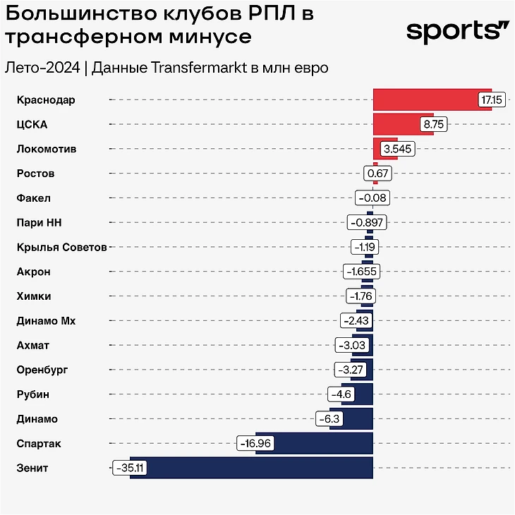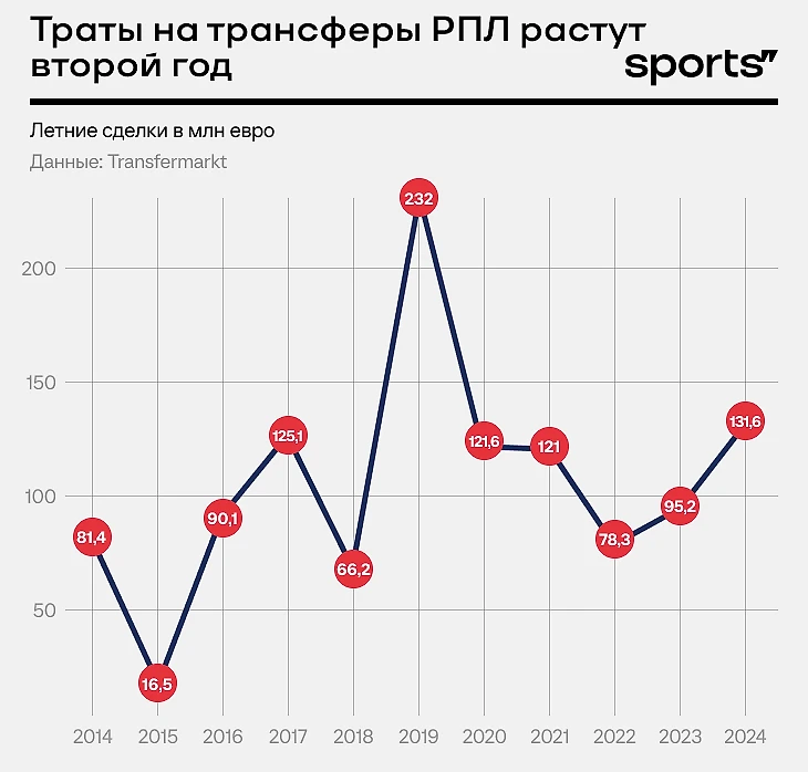 Заработали больше, чем потратили, еще «Локомотив» и «Ростов», у остальных 12 – минус. Так что можно сказать, что лига возобновляет инвестиции в трансферы. Это было второе по сумме потраченных денег лето за 10 лет. После провала 2022-го второй год наблюдается рост.