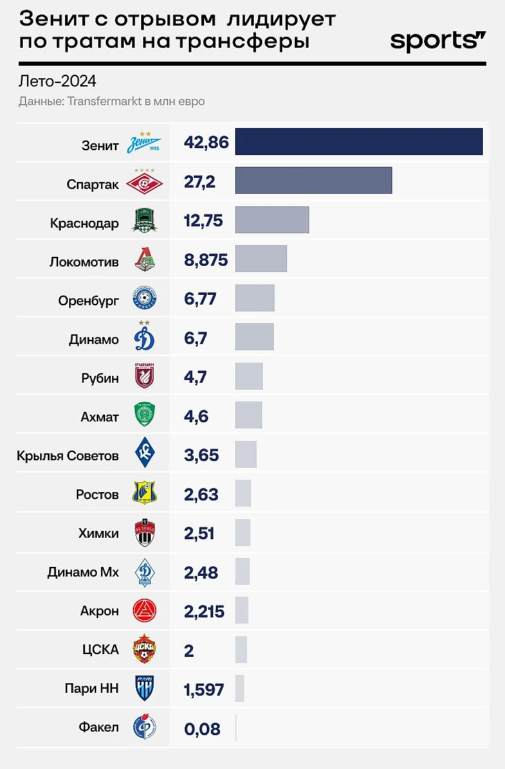 1. Отрыв «Зенита» все еще колоссальный. Петербуржцы настроены сохранить гегемонию в ближайшие годы – потратили больше, чем «Краснодар» и «Спартак» вместе взятые. Более половины из летних расходов чемпиона ушли на трансферы нападающих Лусиано Гонду и Александра Соболева.