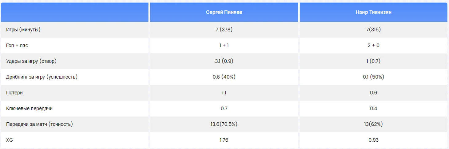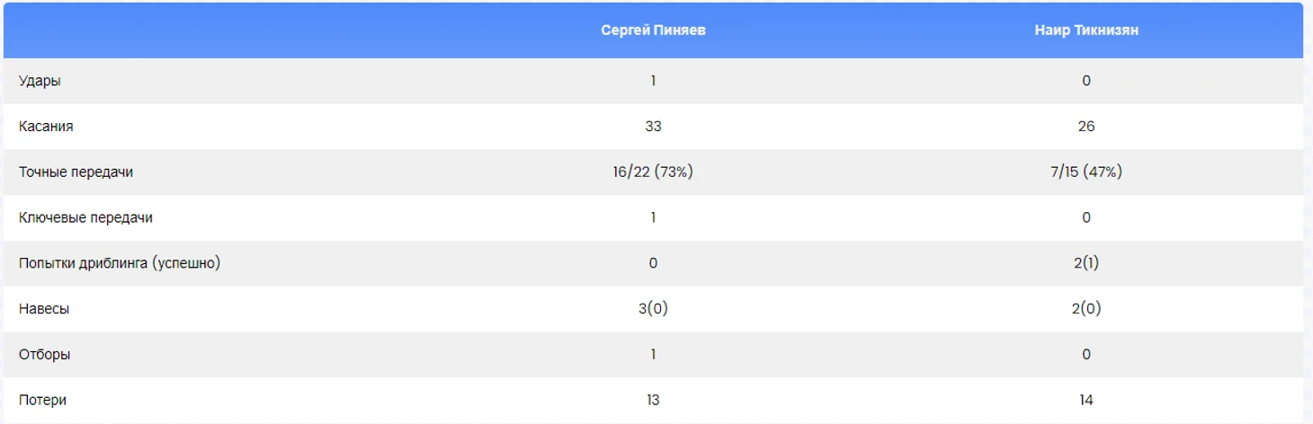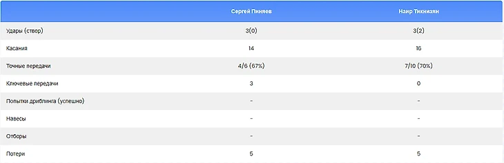 Пиняев провёл на поле в два раза меньше времени, чем Тикнизян, но при этом он успел нанести столько же ударов по воротам и сделал всего на два касания мяча меньше. Из четырёх его точных передач три были ключевыми, в то время как у Тикнизяна не было ни одной такой передачи.