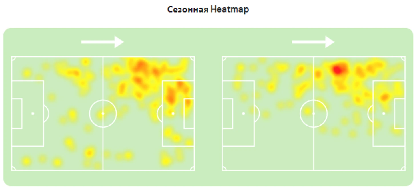 Если рассматривать средние позиции игроков, то мы видим, что Пиняев активно действует в штрафной зоне, он более активен в атаке. В то же время Тикнизян занимает позицию слева, чуть выше центральной линии поля.