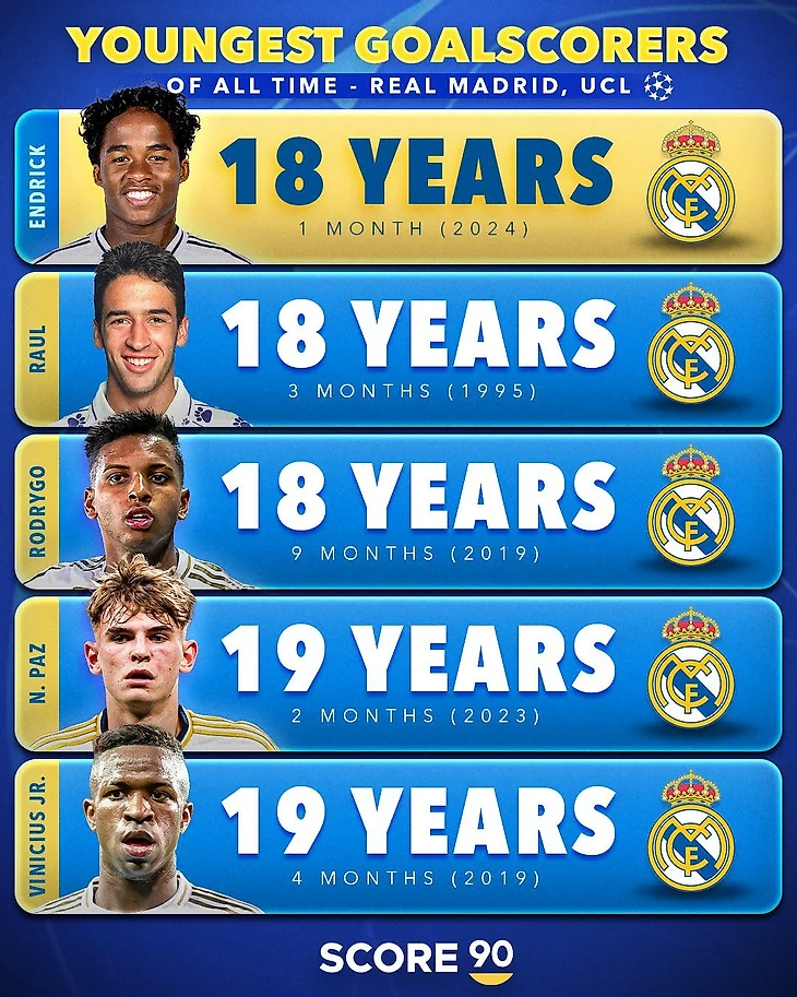 В рейтинге самых молодых авторов голов бразилец обошел легенду «Мадрида» Рауля. Кроме того он оставил позади тройку действующих футболистов клуба − Родриго, Нико Паса и Винисиуса Жуниора.