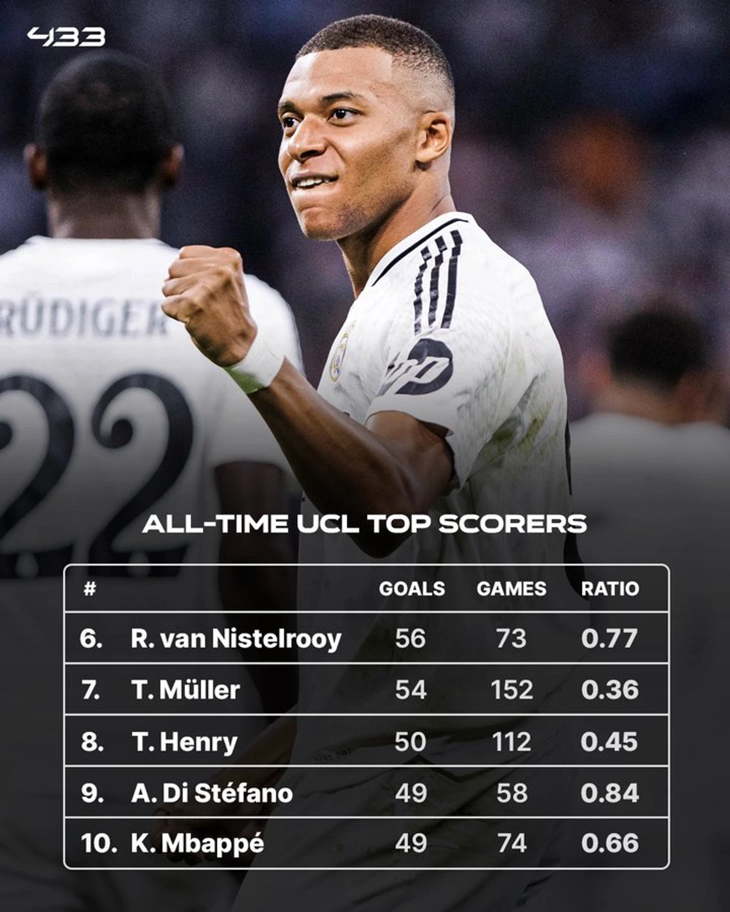 Кажется, что все упустили важный момент – Килиан Мбаппе не просто забил дебютный гол в Лиге чемпионов за мадридский «Реал». Он вошел в элитную десятку.