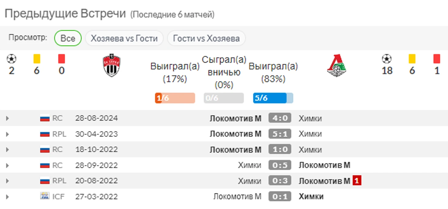 Последние 6 матчей этих команд закончились 5 победами «Локомотива» с общим счетом 18-2 .