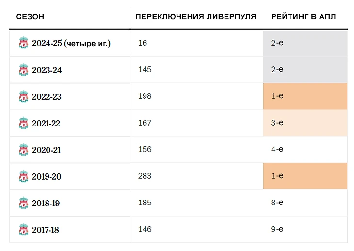 На протяжении пяти последних сезонов Клоппа, с 2019/20 по 2023/24 годы, «Ливерпуль» неизменно входил в четверку лучших по количеству переключений в Премьер-лиге (как видно из таблицы ниже).