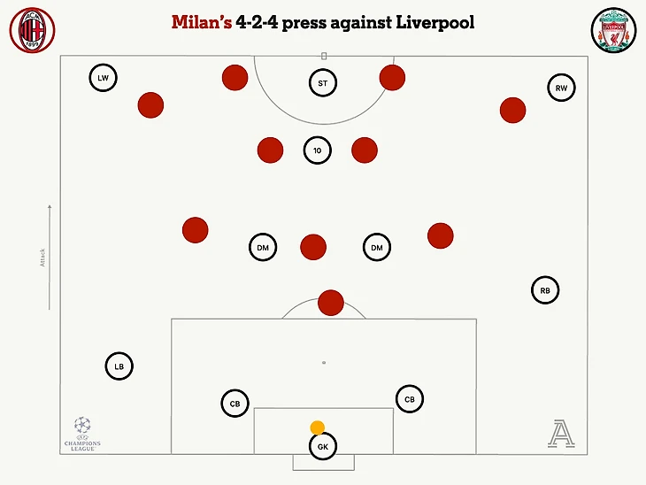 В прессинге передней четверки «Милана» центральный нападающий и атакующий полузащитник должны были поочередно прикрывать оборонительного полузащитника «Ливерпуля», а другой, в свою очередь, прессинговать заднюю линию.