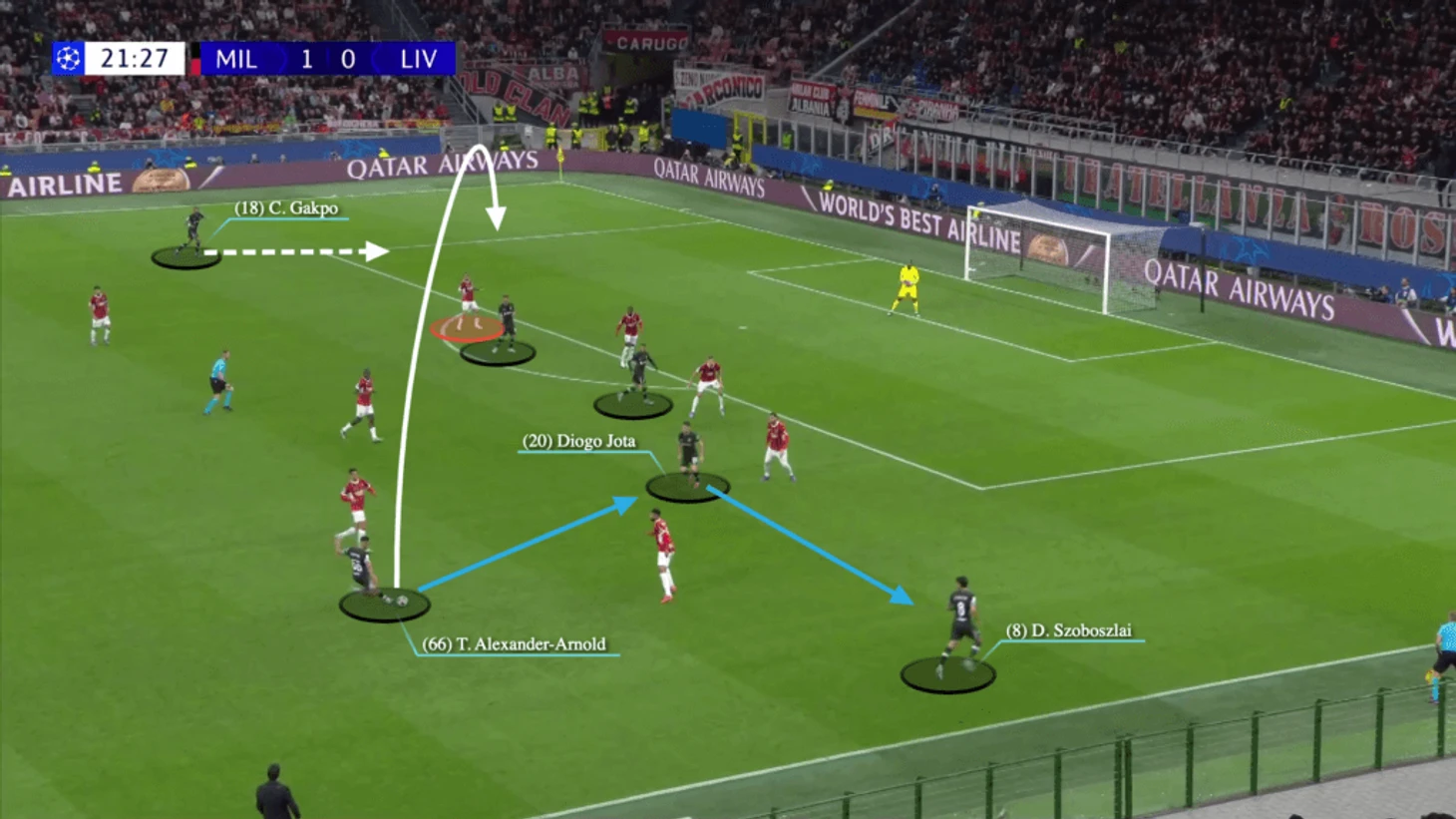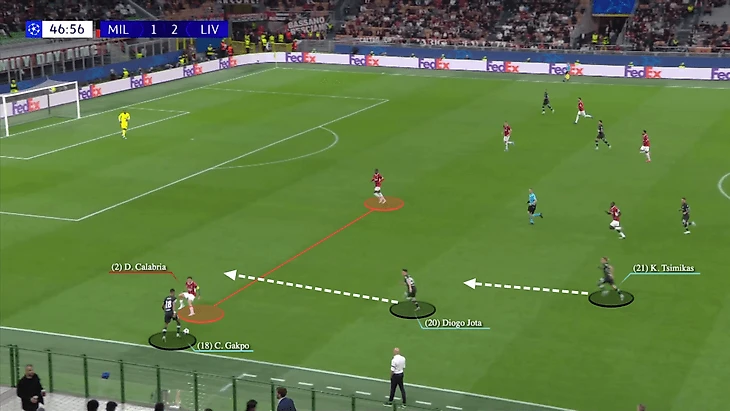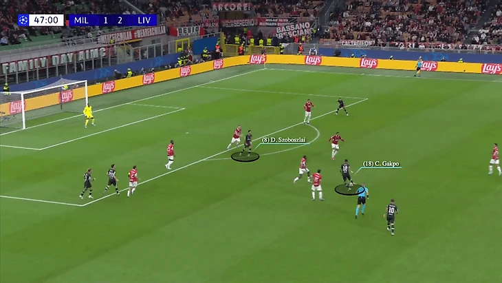 Здесь, в первой атаке игры, мы видим этот прессинг, в то время как центральный нападающий Диогу Жота набрасывается на полузащиту, а атакующий полузащитник Доминик Собослаи отходит в край. Это напрягает двоих игроков полузащиты «Милана», которые пытаются справиться с тремя игроками, учитывая, что Райан Гравенберх вырывается из глубины поля.