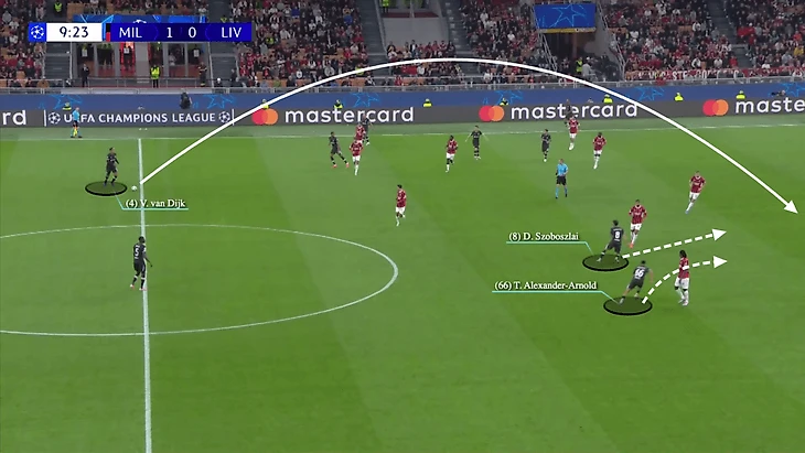 Переключения обычно работают, потому что они изолируют вингеров от защитников и могут быть использованы для использования пространства, создавая возможности для забеганий и смещения в центр — но при Слоте «Ливерпуль» использует своих защитников иначе. Правый защитник Трент Александер-Арнолд играет смешанную роль и часто находится в полузащите, выполняя роль дополнительного «шестерки», а левый защитник (обычно это Энди Робертсон, но против «Милана» его заменил Костас Цимикас) располагается глубже, чтобы быть третьим центральным защитником.