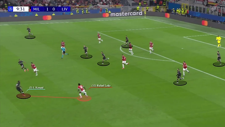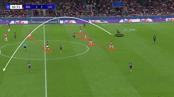 Здесь «Милан» мог выбежать в контратаку и найти Рафаэля Леао, когда шесть игроков «Ливерпуля» были впереди мяча. Ибраима Конате хорошо отзащищался и выиграл поединок, но именно такую ситуацию Слот хочет предотвратить.