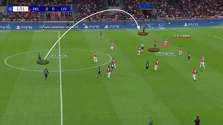 Здесь Вирджил ван Дейк, не испытывая давления, переключает игру на Коди Гакпо, который оказался на пространстве, потому что Жота зажал Давиде Калабрию.