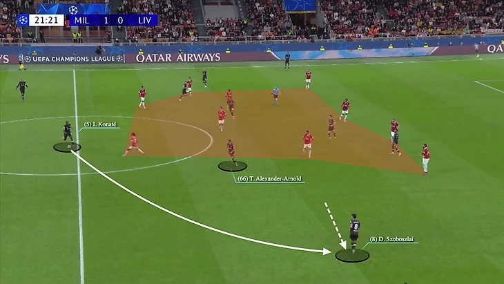 Александер-Арнолд занимает узкую позицию в полузащите, которая прижимает блок «Милана» к центру, и Конате находит Собослаи в полузащите.