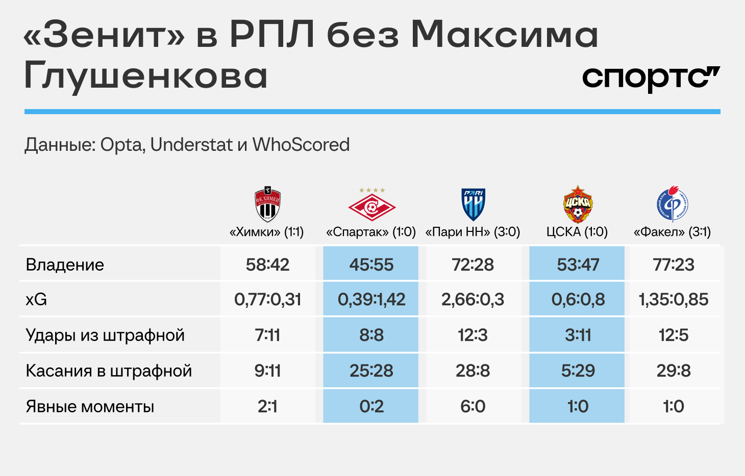 «Зенит» выбирал разные стартовые планы и сочетания, но реально угадал только с выходом Лусиано Гонду на мертвый «Пари НН». В Нижнем и против «Факела» «Зенит» выбил большую часть статистики после травмы Глушенкова, а против «Химок», «Спартака» и ЦСКА создавал меньше ожидаемого гола.