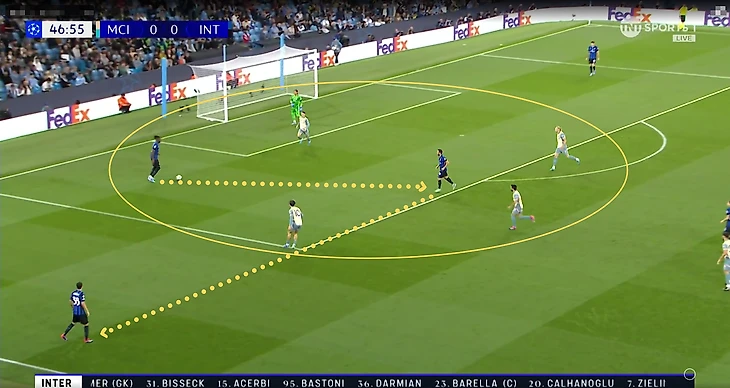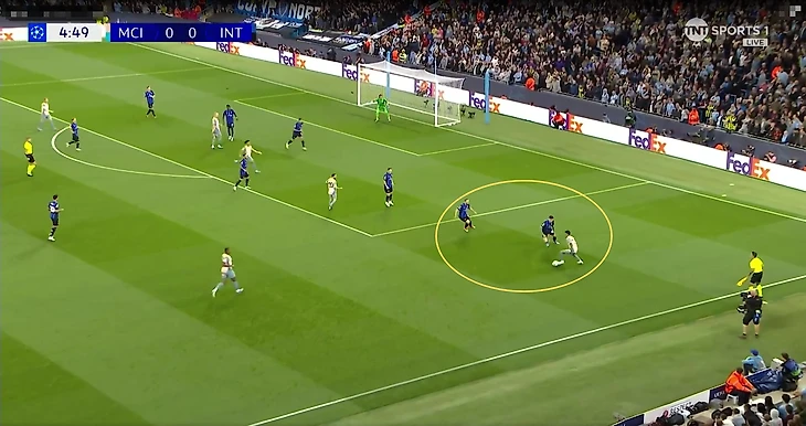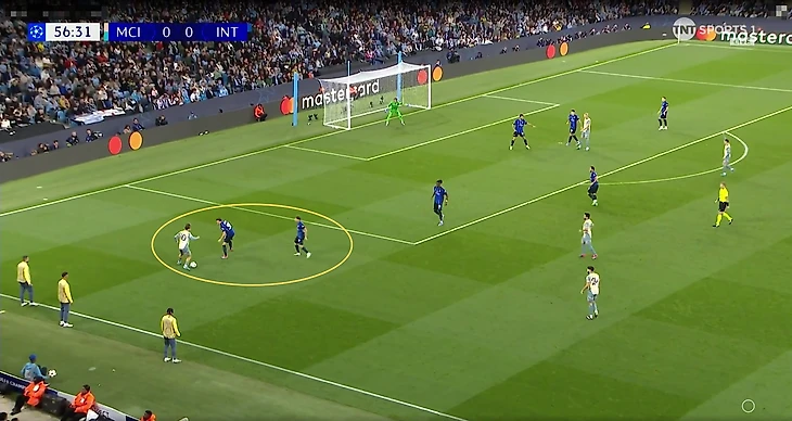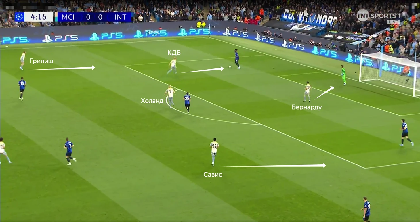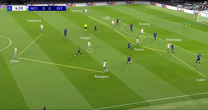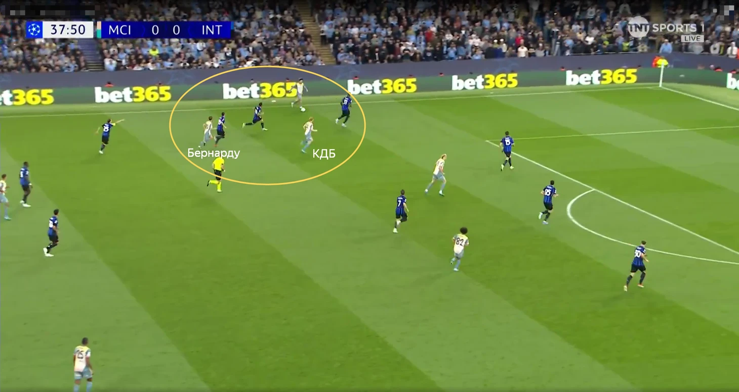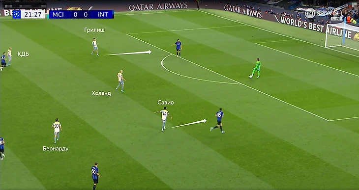 В результате «Сити» логичным образом чаще задействовал фланги. Де Брюйне, Бернарду и Льюис могли либо опускаться для помощи с розыгрышем, либо уходить на фланги и создавать перегруз там. Ключевое здесь то, что «Интеру» удалось минимизировать опасность через центр.
