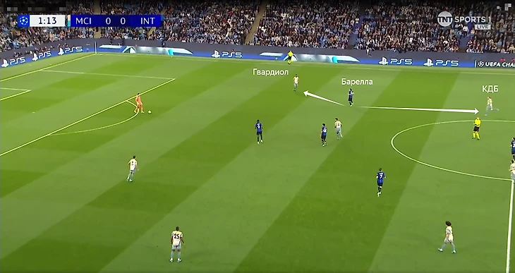 Без мяча команда Индзаги не стремилась встречать соперника высоко на постоянной основе (PPDA = 24.2). Чаще откатывались в средний/низкий блок. При этом в ситуациях, когда итальянцы все-таки пытались пойти в прессинг большой объем работы падал на Бареллу: Николо был вынужден и и оказывать давление на защитника (Гвардиол), и перекрывать направление паса на десятку за спиной (Кевин). В целом итальянец справился с задачей на хорошем уровне.
