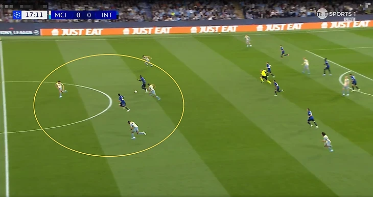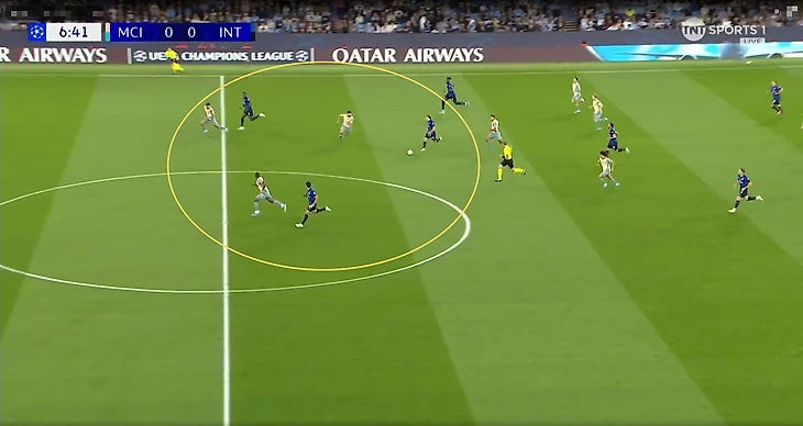Против «Интера» ситуация была аналогичной. Итальянцы периодически получали возможность разбегаться на свободном пространстве через центр, где Родри был фактически в роли догоняющего. При этом команда Индзаги не смогла реально воспользоваться подобными шансами.