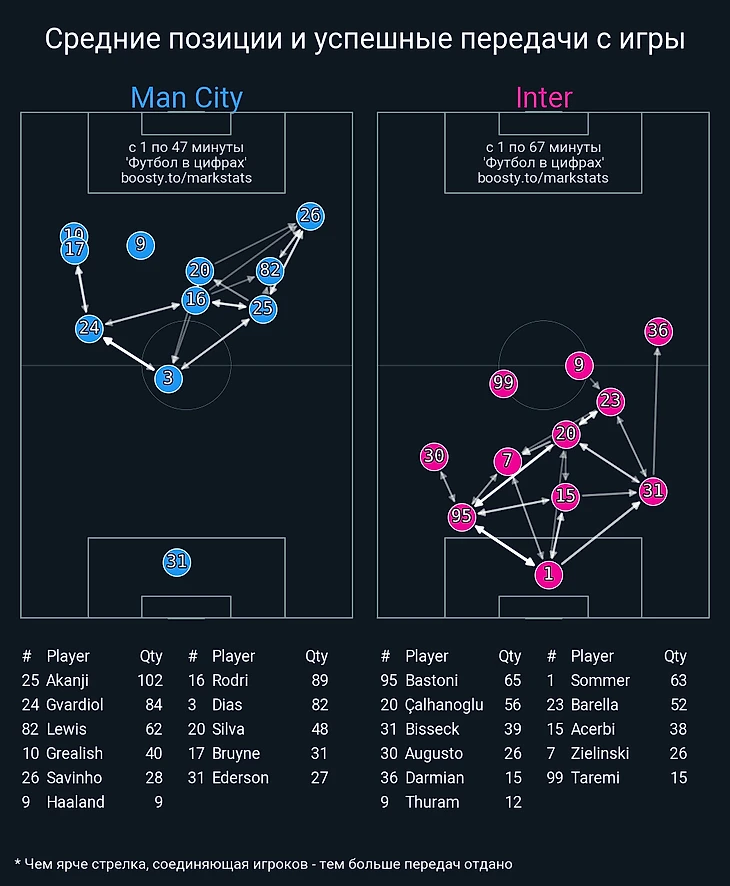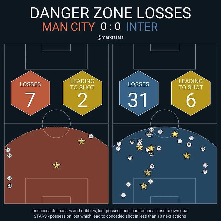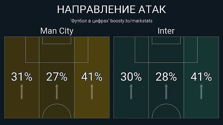 Например, у «Интера» не набралось ни одной позиционной атаки (10+ пасов на чужой половине поля) за весь матч. У «Сити» – 18.