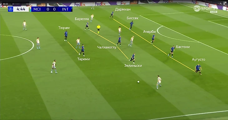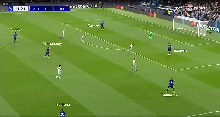 Еще до матча можно было предположить, что «Сити» будет больше владеть мячом, а команде Индзаги придется чаще обычного обороняться. В такой конфигурации «Интер» в большинстве случаев действовал по схеме 5-3-2.