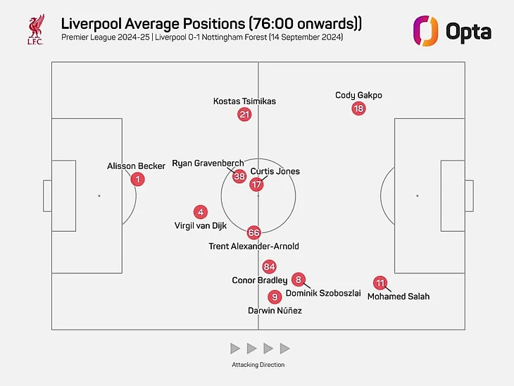 Победный гол Каллума Хадсона-Одои, начавшийся после того, как Нуньес проиграл борьбу на краю штрафной площади соперника, привел к тому, что «Ливерпулю» нужно было забить два гола за 18 минут. На приведенной ниже карте средних позиций с 76-й минуты до конца тайма Нуньес действовал на позиции правого защитника, а не «девятки».