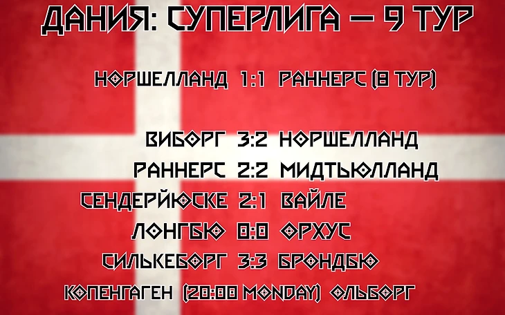 Нынешние чемпионы в субботу не очень удачно съездили в гости к «Раннерс». Пропустили первыми ранний гол, но быстро отыгрались благодаря Франкулино. К концу первого тайма Симен Нордли вывел хозяев вперед, а на 65-й минуте «Мидтьюлланд» остался без талантливого вингера Дарио Осорио, чилиец был удален с поля. Однако гости хоть и не создавали опасных моментов во втором тайме, но сравнять все же удалось. На 91-й минуте с пенальти забил Арал Симсир.