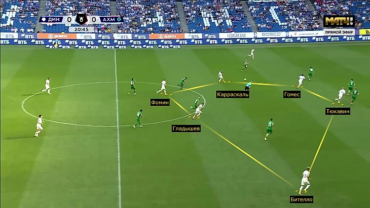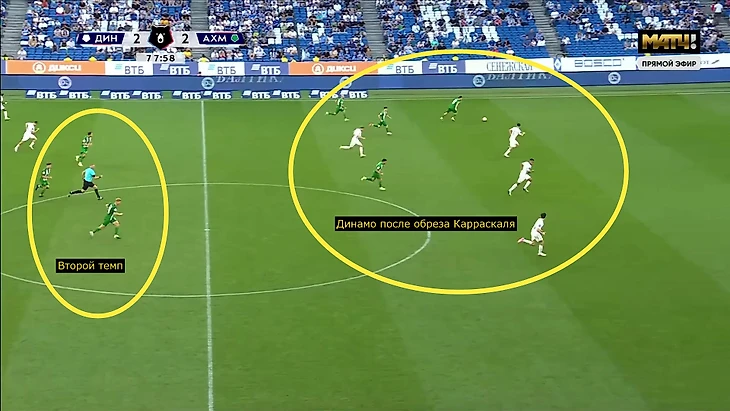 Это вынуждало «Зенит» выбивать и пару раз чуть не привело к ошибкам около штрафной. Опасный режим для «Динамо»: Лунев не идеален в игре ногами, а выносы вперед от него и центральных защитников – удобный сценарий для дисциплинированной защиты «Спартака».