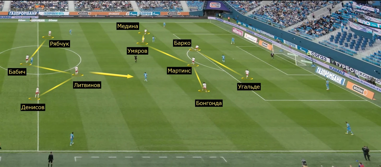 1. «Спартак» способен задавить Андрея Лунева и центральных защитников «Динамо» первой волной прессинга. Тут важен пример из матча с «Зенитом», расстановка которого совпадает с 4-3-3 «Динамо». «Спартак» перекрывал 4-3-3 переходом на 4-4-2: Барко поднимался в прессинг по центральным защитникам к Угальде, вингеры играли по крайним защитникам, опорники разбирали ближайших полузащитников на мяче, крайние защитники – вингеров один в один, а Руслан Литвинов был готов страховать середину.