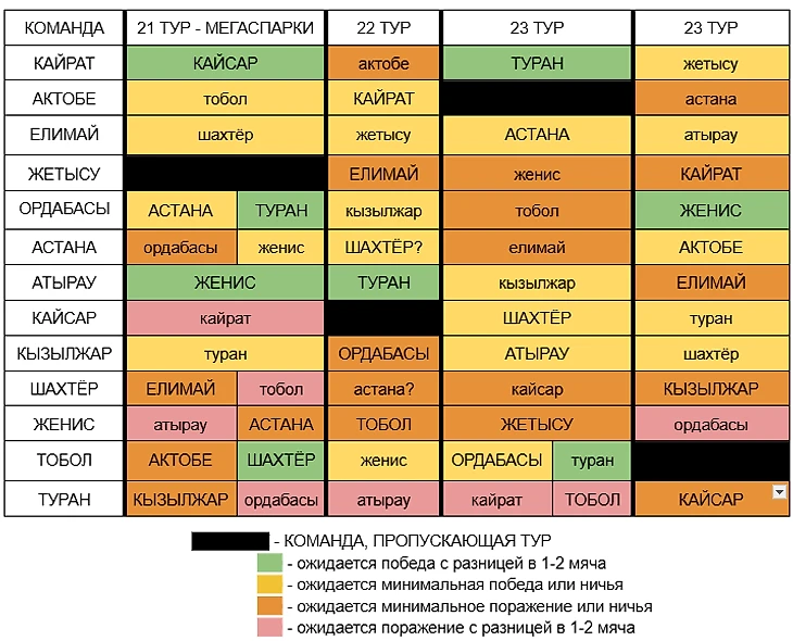 На календаре стоит остановиться поподробнее. В этом туре не сыграет «Жетысу». У «Ордабасы», «Астаны», «Шахтёра», «Жениса», «Тобола» и «Турана» будет по два матча в туре. Предпочтительно иметь игроков именно из этих команд.