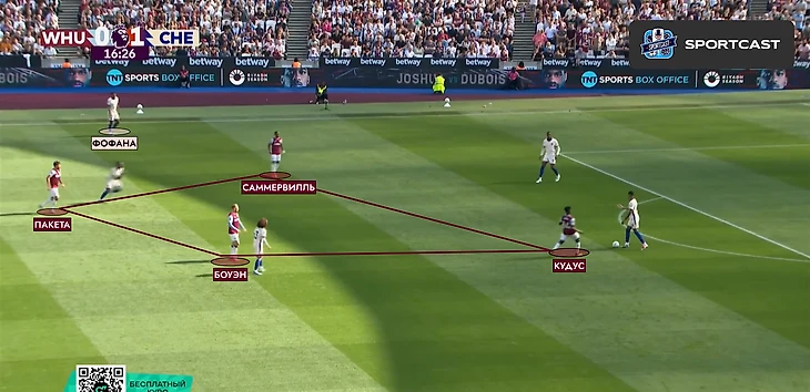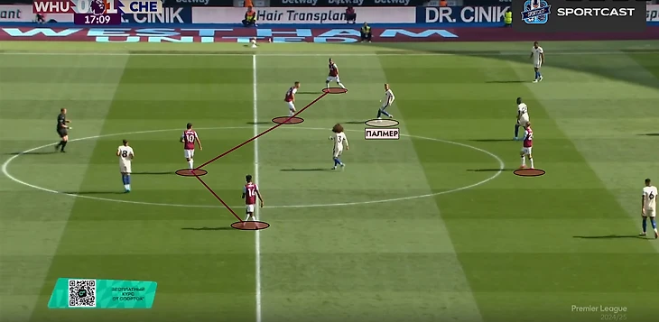 «Вест Хэм» активно прессинговал первую линию защиты и опорную зону «Челси», образуя условный квадрат. Первую линию прессинговали Кудус и Саммервилль, а за опоркой следили Боуэн и Пакета. Сам Джаред мог подниматься выше, меняя кого-то из вингеров. Такая система хорошо перекрывала движение в центре поля, но совсем ослабевала на флангах, где стабильно был открыт Фофана и вглубь опускался Энцо. К тому же, шла игра у Колвилла и Санчеса – у обоих 7 передач с продвижением за весь матч.