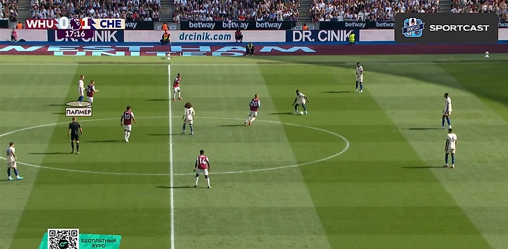 Так, сначала Палмер поднимается к центральному кругу для розыгрыша мяча, отвлекая на себя внимание Родригеза.