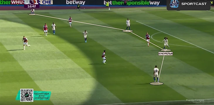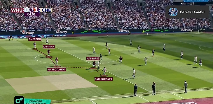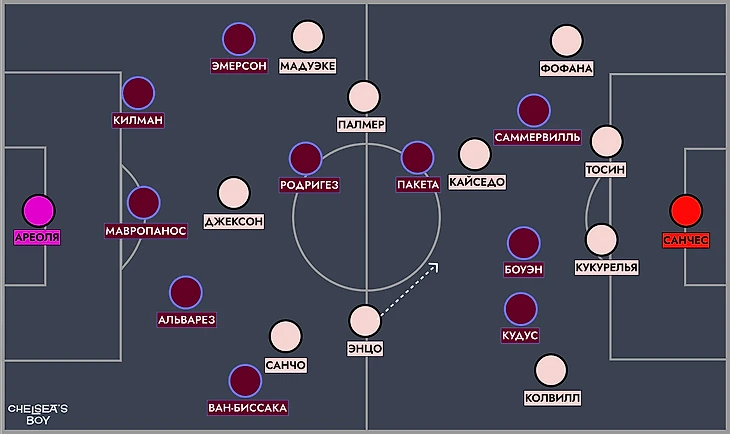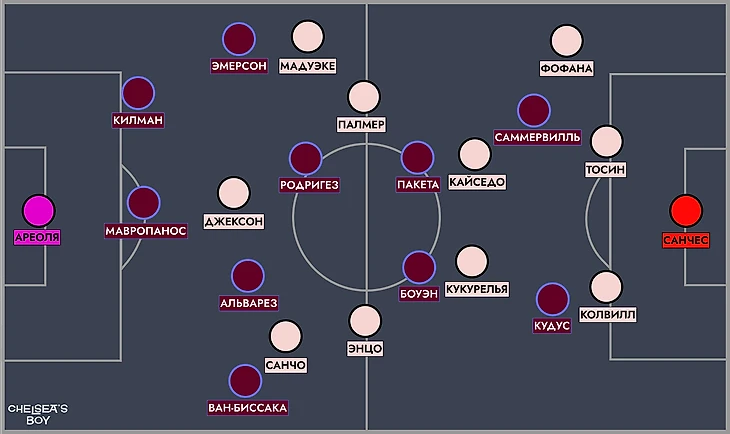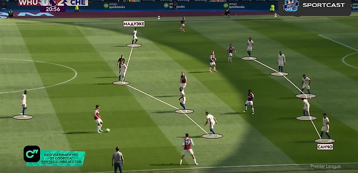 Не помогали подключения Ван-Биссаки и Эмерсона. Высокая позиция фуллбеков «молотобойцев» хоть и оказывала давление на восьмерки «Челси», но также открывала фланги для Мадуэке и Санчо, создавая им ситуацию 1 в 1.