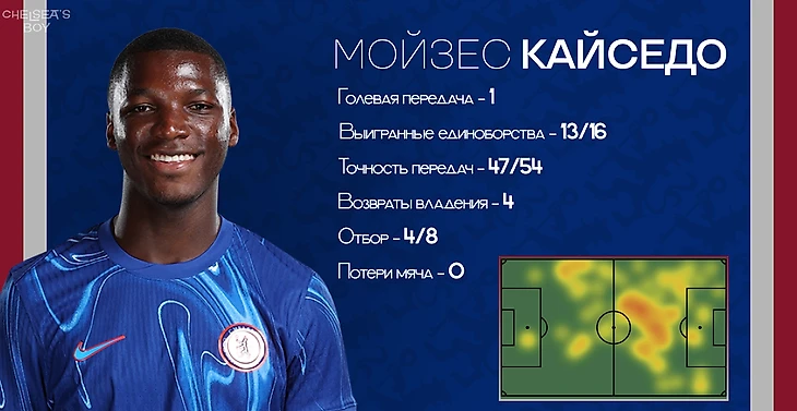 Мойзес показал просто феноменальные цифры для своей позиции. Кайседо приносил пользу не только в обороне, но и успешно начинал атаки, продвигал мяч – а его передача на второй гол Джексона заслуживает отдельной похвалы.