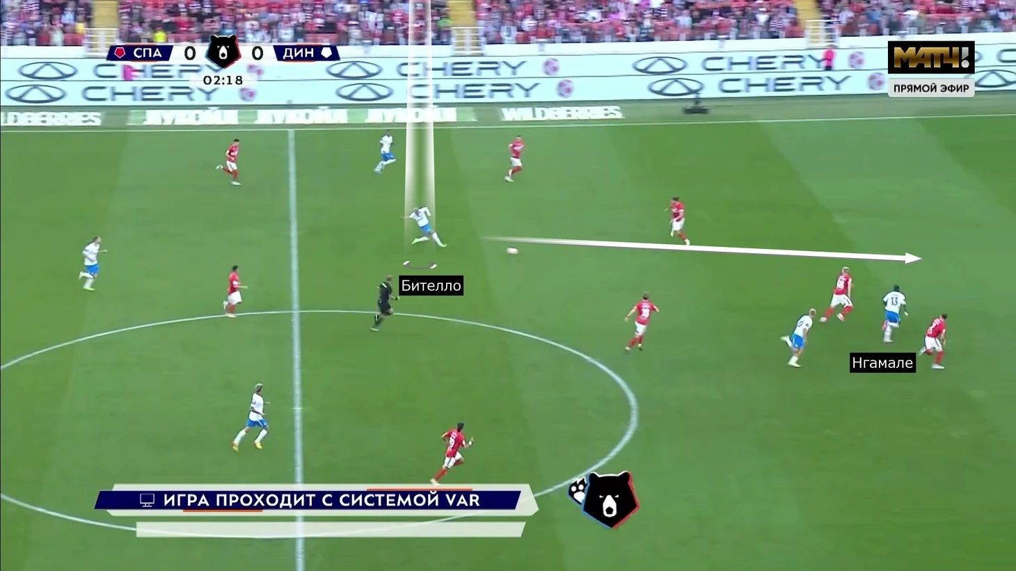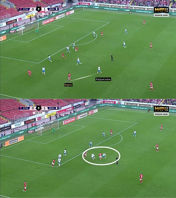 1. Пропущенный гол – из-за мини-провала в прессинге: Даниил Хлусевич завис наверху, Роман Зобнин вынужденно сел за вингером Артуром Гомесом, Руслану Литвинову пришлось подняться к Бителло (планировалось, что Барко – Зобнин – Умяров будут разбирать Фомина – Бителло – Карраскаля один в один). Дальше – дело техники, Бителло воспользовался свободной зоной, а вернувшийся после травмы Муми Нгамале блестяще забежал в середину.