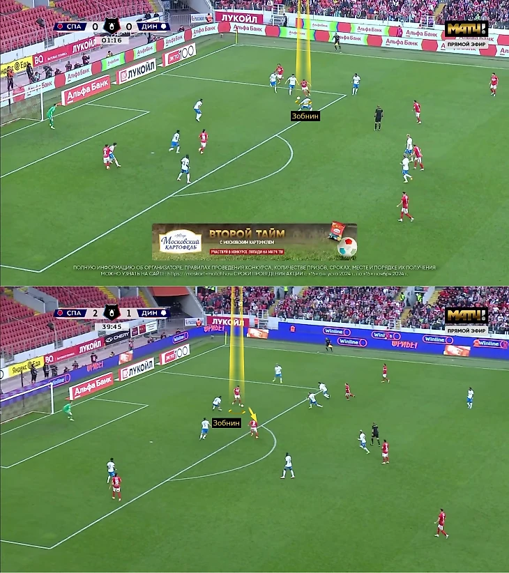 «Динамо» планировало разбирать середину «Спартака» один в один: ради этого Бителло поднимался к Наилю Умярову, а Хорхе Карраскаль и Даниил Фомин встречали ниже. Но работало не всегда: Карраскаль рандомно выключался из борьбы (мог хорошо отработать, мог отключиться) или зависал в атаке.