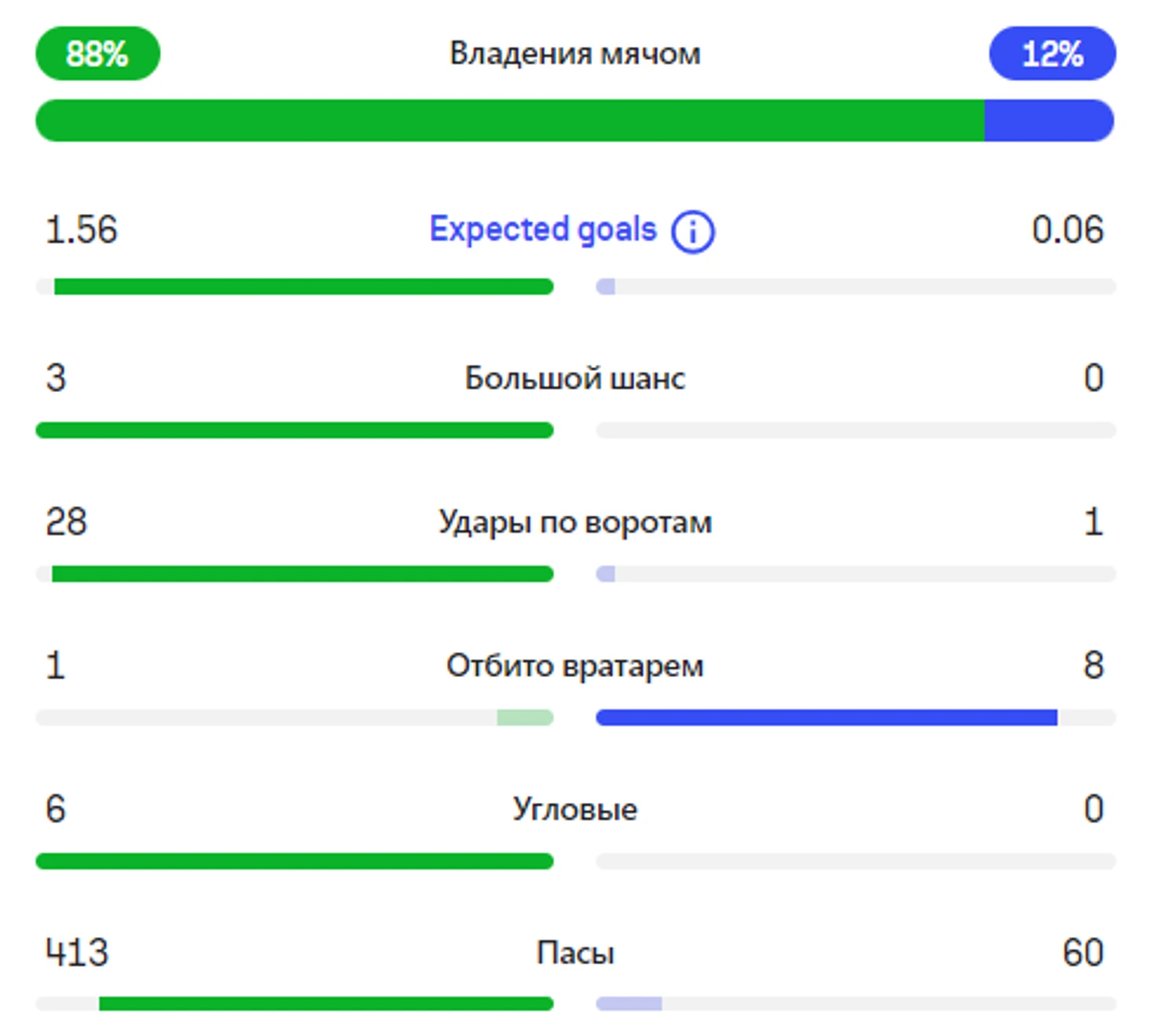 Второй тайм превратился в фирменный навал от команды Пепа Гвардиолы. Статистика ярко показывает, что происходило на поле.