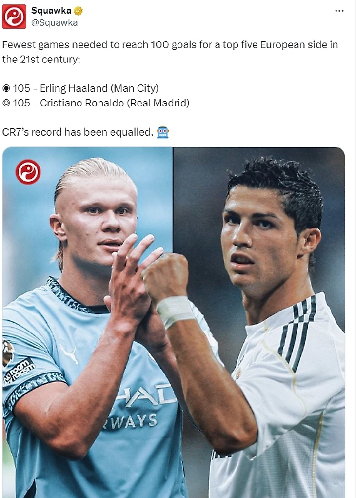 По информации портала Squawka, Эрлингу, как и Криштиану в свое время, понадобилось наименьшее количество матчей за команду, входящую в пятерку сильнейших европейских клубов ХXI века, чтобы забить 100 голов.