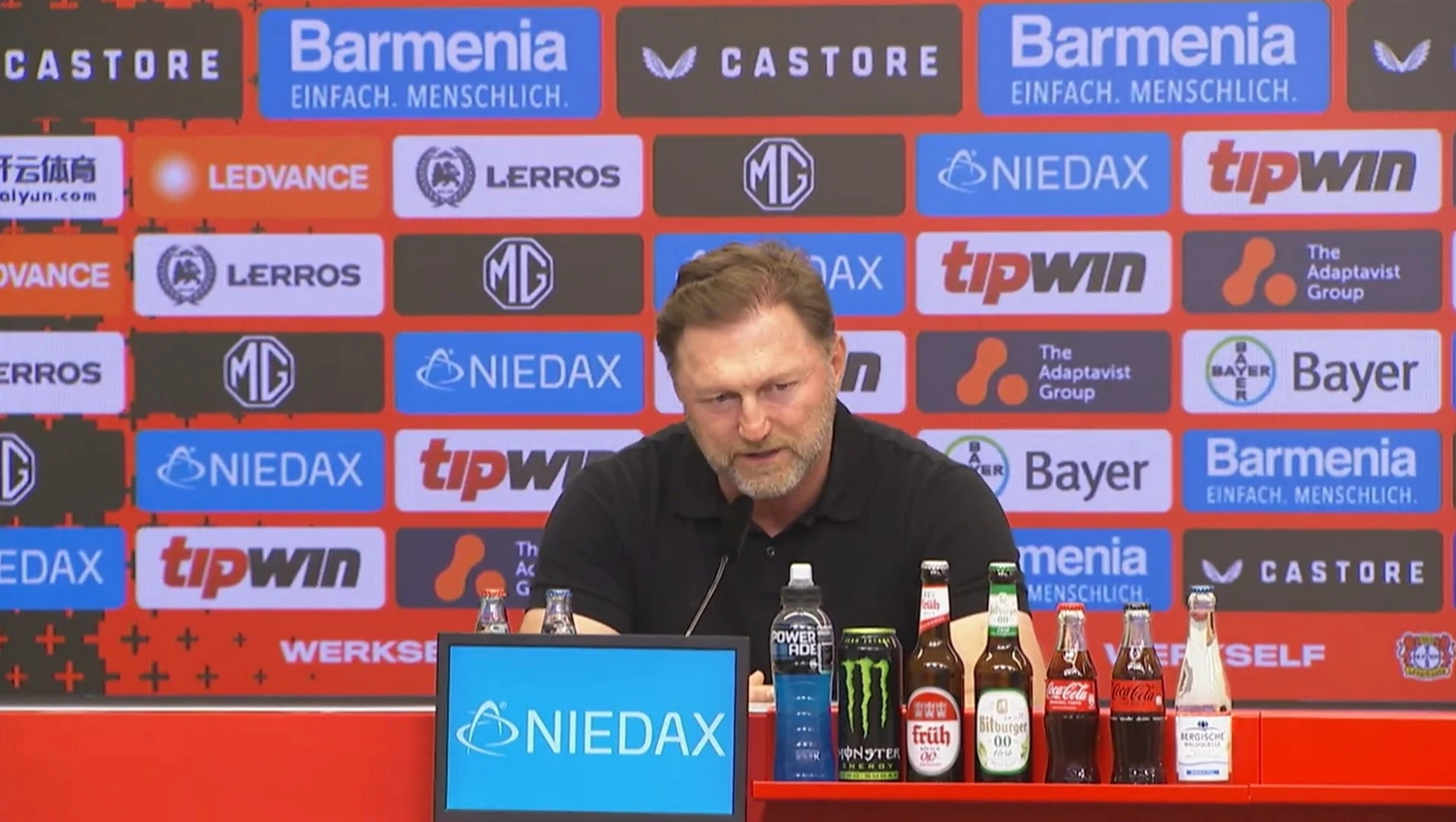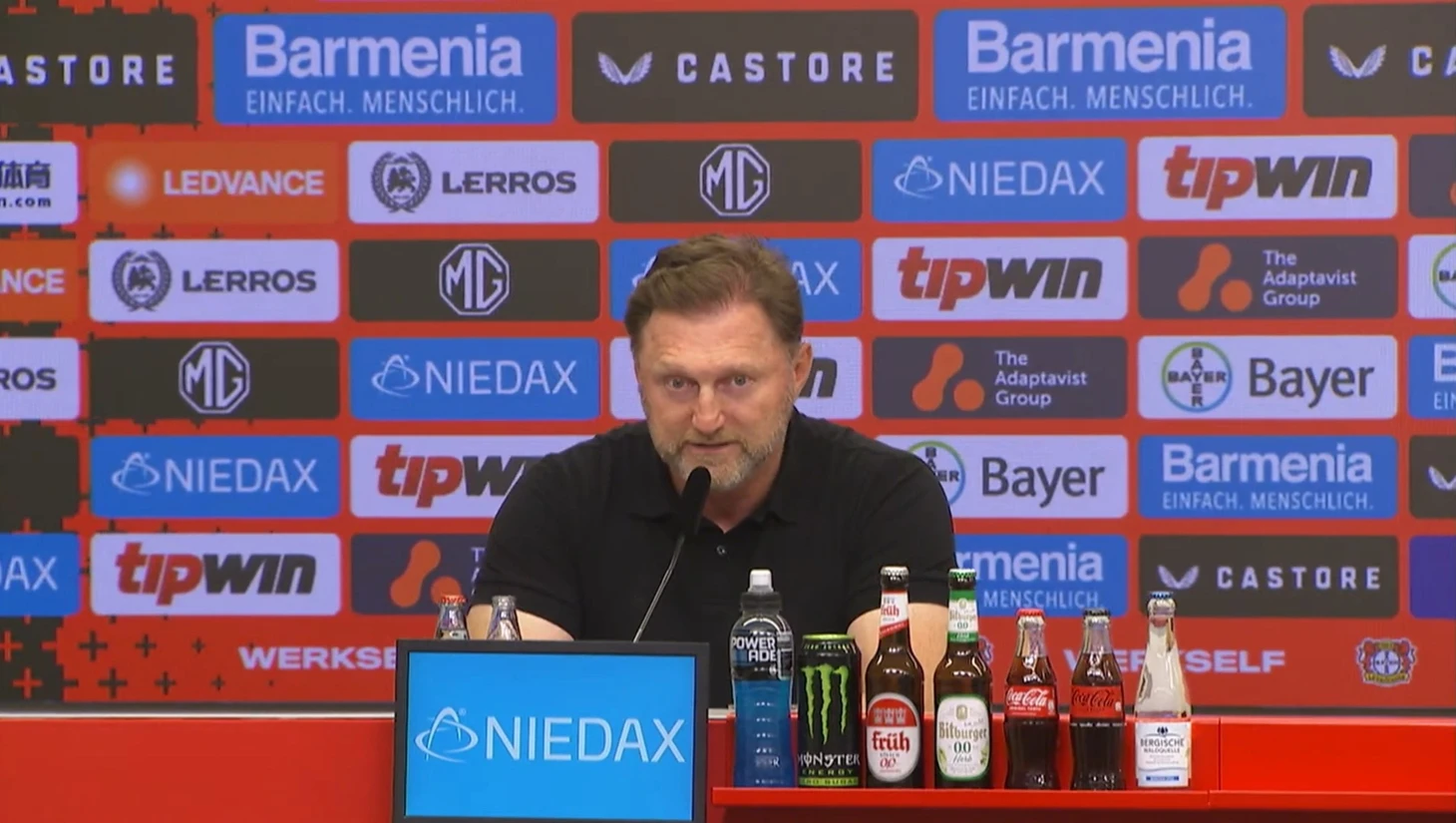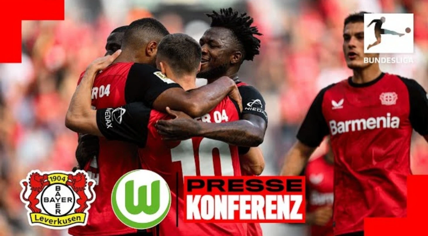 «Всем добрый вечер и добро пожаловать на пресс-конференцию после игры между «Байером 04» из Леверкузена и «Вольфсбургом». Я также приветствую обоих тренеров!».